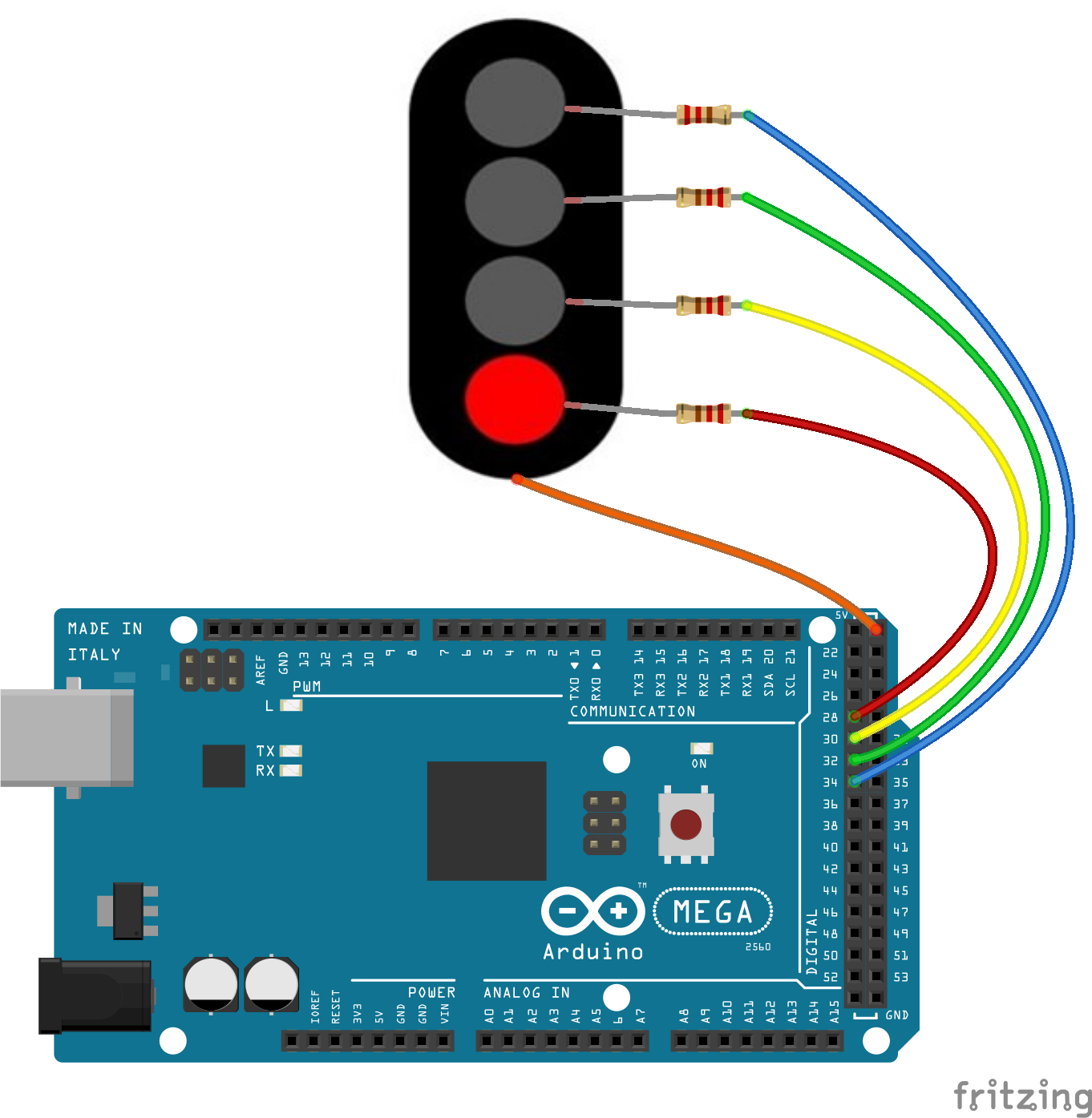 We would connect this signal as outlined below, with the red connected to pin 28, the first amber to 30, green to 32, and the second amber to 34.