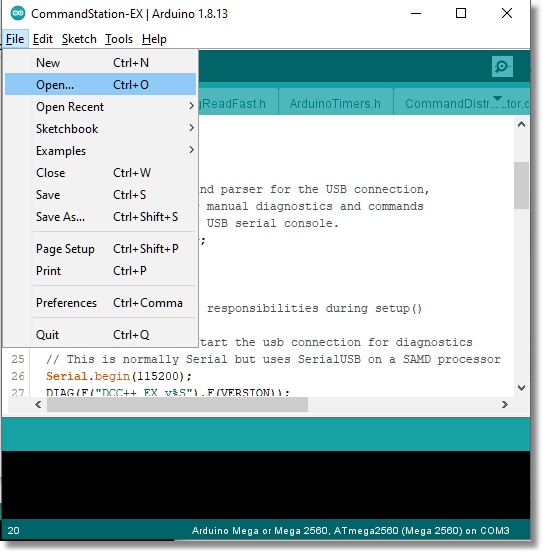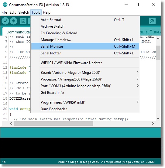 Those on the Engineer path (see Ready-to-Run or Do-It-Yourself - Choose your Level) may want to make changes to the code, or just learn more about how the EX‑CommandStation software works. At a minimum, you may need to change options in the ‘config.h’ file, or use the IDE’s “Serial Monitor” to monitor your Command Station, get logs if something is not working, or enter commands to test out features.