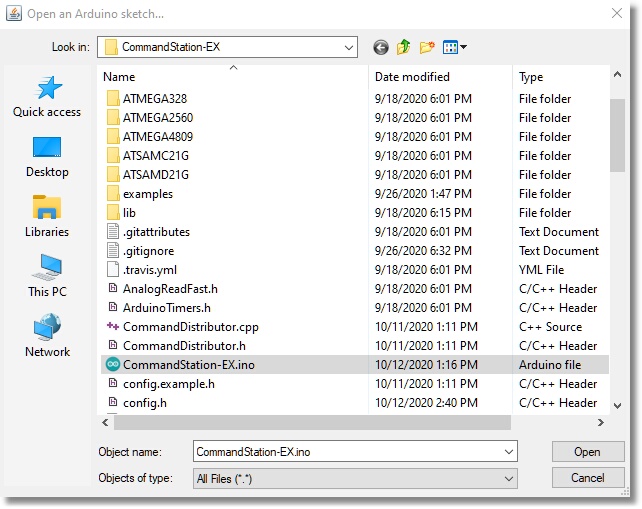 Then click on the “CommandStation-EX” sketch folder to open it. Scroll down to the “CommandStation-EX.ino” file (It should have the round, blue Arduino logo on it) and open that file. We also provide example .ino files for those advanced users who want to use optional features like the “User Command Override” feature, high current motor boards, etc. But for now, and for most users, this will be all you need.