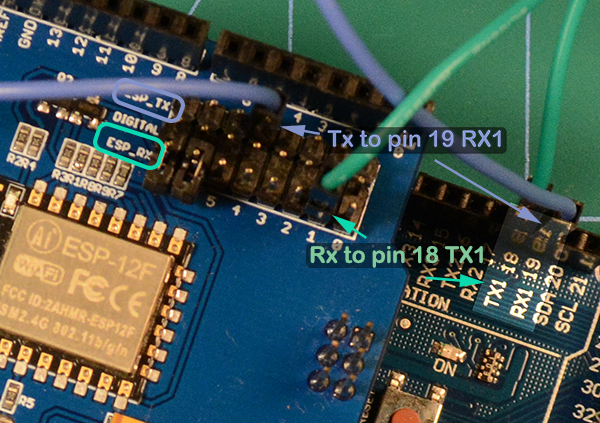 We now need to connect The Transmit (Tx) and Receive (Rx) pins on the ESP8266 to the Rx and Tx pins for Serial1 on the Mega. The Mega has one serial port connected to the USB port, and then 3 extra ones we can access from pins on the board. You can think of Tx as “talking” and Rx as “listening”. That will help you remember that if one thing is talking, the other has to use its ears to listen. So we must connect the Tx of the WiFi board to Rx1 on the Mega and the Rx pin on the WiFi Board to Tx1 on the Mega.