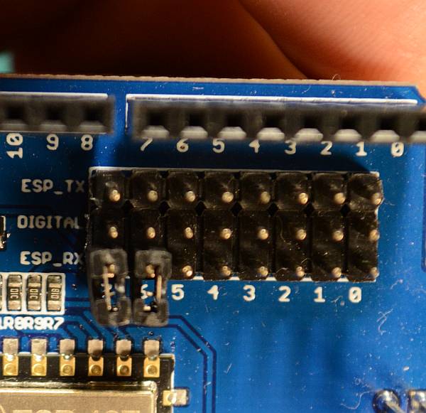 Note the two black plastic jumpers: we need to remove both of them. You can pull them off with your fingers or needle nose pliers and either stick them in a drawer or move them to the side by having them connect via one side to any of the row of Rx pins. The other end of the connector will just hang out over the WiFi Board.