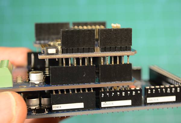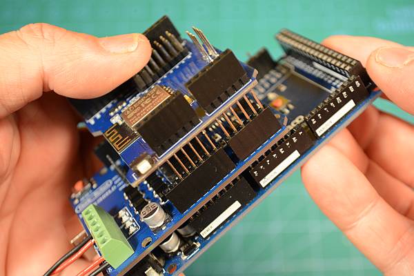 Note that the pins are quite long and will not go all the way into the header. You should have even more of the pins showing between the bottom of the WiFi board and the top of the header on the Motor Board than between the Motor Board and the Arduino. This is normal (see Fig 91:).
