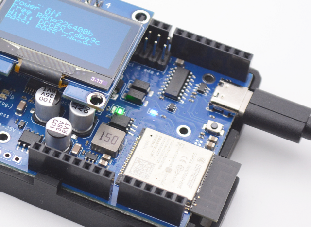 The OLED display provides diagnostics, status, and general information. The OLED display can also show output from EXRAIL scripts including user defined text. By default, the display shows the version number, license, power status, free memory, and if configured, your WiFi access point login information.