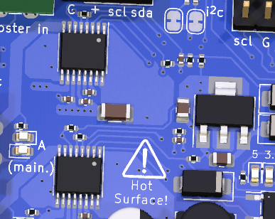 The entire area shown in the image to the right can get extremely hot during operation. Be carful not to touch this area at the top or bottom of the board to avoid being burned. This is especially true at high track current levels. Also be sure to provide proper ventilation to the board. If placed in a case, that case must have proper ventilation. Consider using proper vent holes and a fan if you intend to place the EX‑CSB1 inside an enclosure.