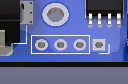These unpopulated solder pads are used internally for testing and can provide power connections for an optional header. When operated without an EX‑MotorShield8874 on top, a user could remove the barrel jack and solder pins here capable of handling the 5A maximum current to power the board and the track.
