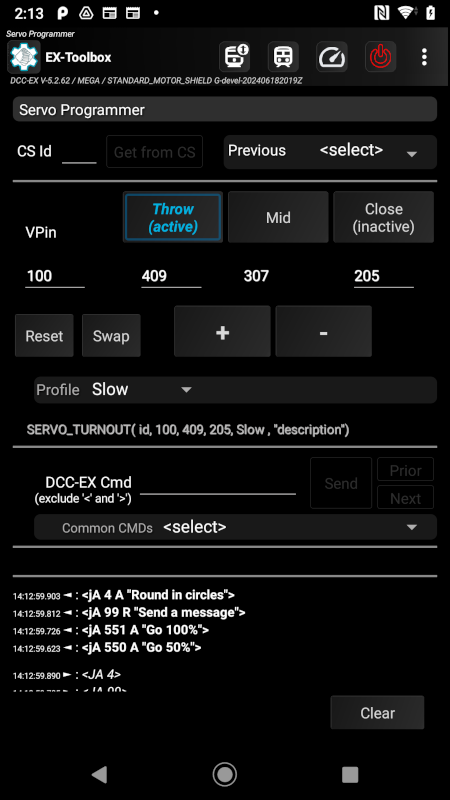 The servo motor test screen will allow you to test and fine tune the settings needed for configuring servo motors attached to the EX‑CommandStation. This is intended to be temporary. To permanently configure a servo motor you will need to record the values and include the in the configuration of your EX‑CommandStation.