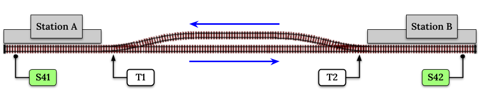 So what about routes that cross or share single lines (passing places etc)? Let’s add a passing place between A and B. S= Sensors, T=Turnout number. So now our route looks like this: