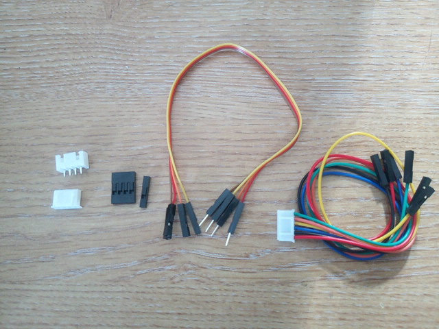 Fig 225: From left-to-right, JST-XH connectors, Dupont connector shells, Dupont cable, and Grove converter cable.