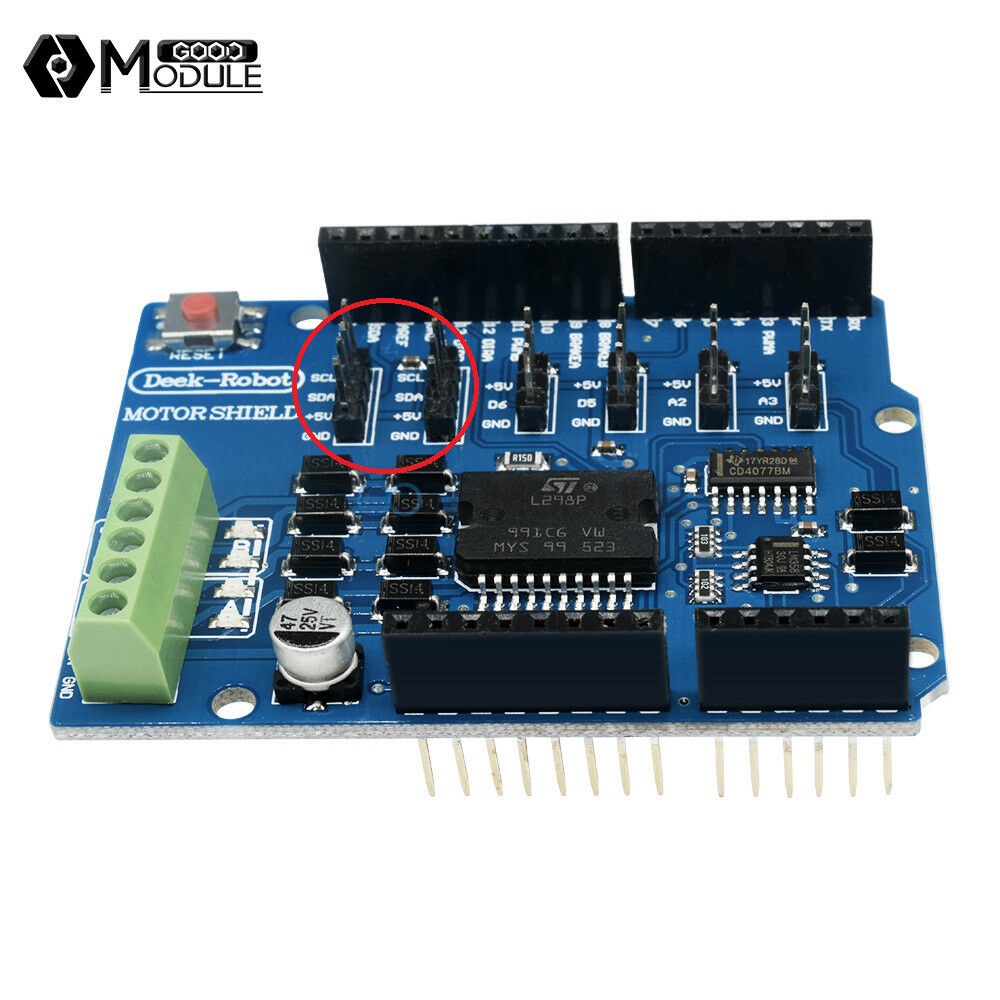 Some motor shields come with header pins for the I2C connections, for example the Standard Motor Driver and the DeekRobot equivalent. The header pins are labelled, and are ringed in the images below.