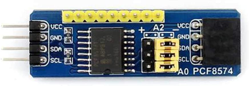 The image below shows a PCF8574 module, which has three yellow jumpers labelled A0-A2, currently shown in the right-hand position marked ‘–’ (=OFF). This means the address is set to 0x20. If we move all three jumpers to the left-hand position (‘+’=ON), then the address will be 0x27.