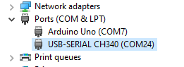Once you can see your computer recognises your board, remember the port. For a PC running windows, it will be something like “COM24” as in the picture above. For a Mac, it will be something like “/dev/cu.wchusbserial*****”, and for Linux it will look like “/dev/ttyUSBx”. Write it down.