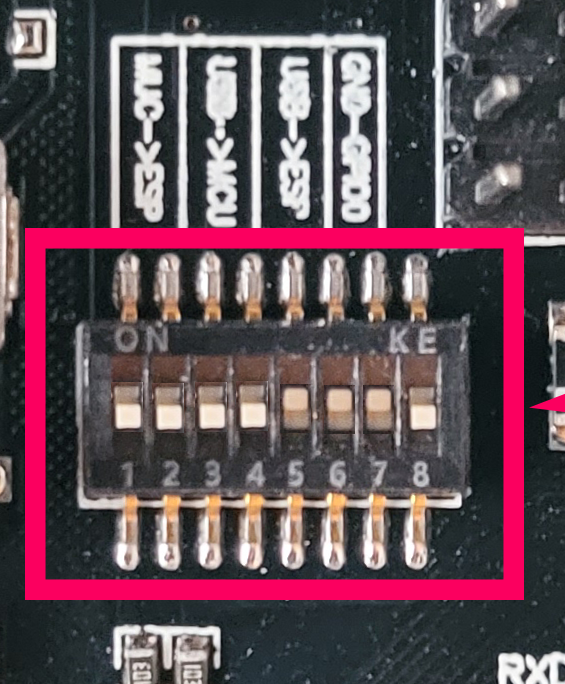 Note that switch 8 is not connected to anything, you don’t need to touch it. With a toothpick or jewellers screwdriver, very gently set your dip switches, it is easy to break them. Use this diagram to set your dip switches, ON is up in this picture. Switches 5,6, and 7 are on.
