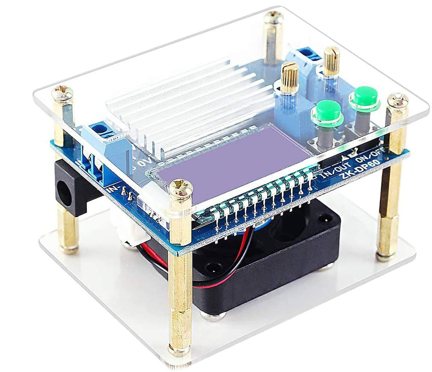 These come in different sizes. Show here is a 2A and a 6A Version. You can look for “60W 6A Adjustable Voltage Regulator with Cooling Fan”, or “DC to DC 5.5V-30V to 0.5V-30V Power Supply Module”. Or just “Buck Boost Voltage Converter”. The bigger unit usually comes with a fan. A model number is a “ZK-DP60”.