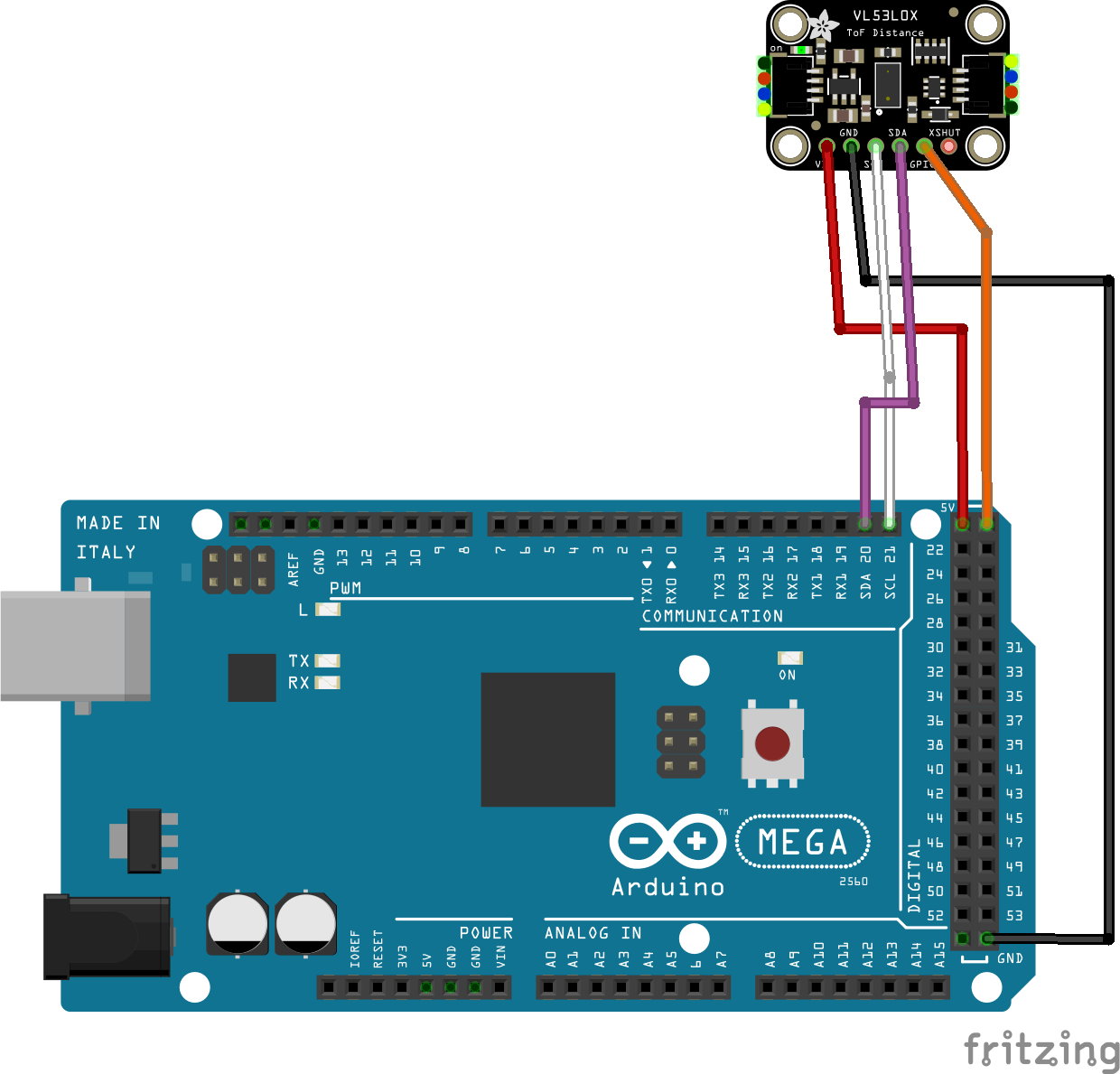 If you have more than one module, then you will need to specify a digital vpin (Arduino digital output or I/O expander pin) which you connect to the module’s XSHUT pin. When the device driver starts, the XSHUT pin is set LOW to turn the module off. Once all VL53L0X modules are turned off, the driver works through each module in turn by setting XSHUT to HIGH to turn the module on, then writes the module’s desired I2C address. In this way, many VL53L0X modules can be connected to the one I2C bus, each one using a distinct I2C address.