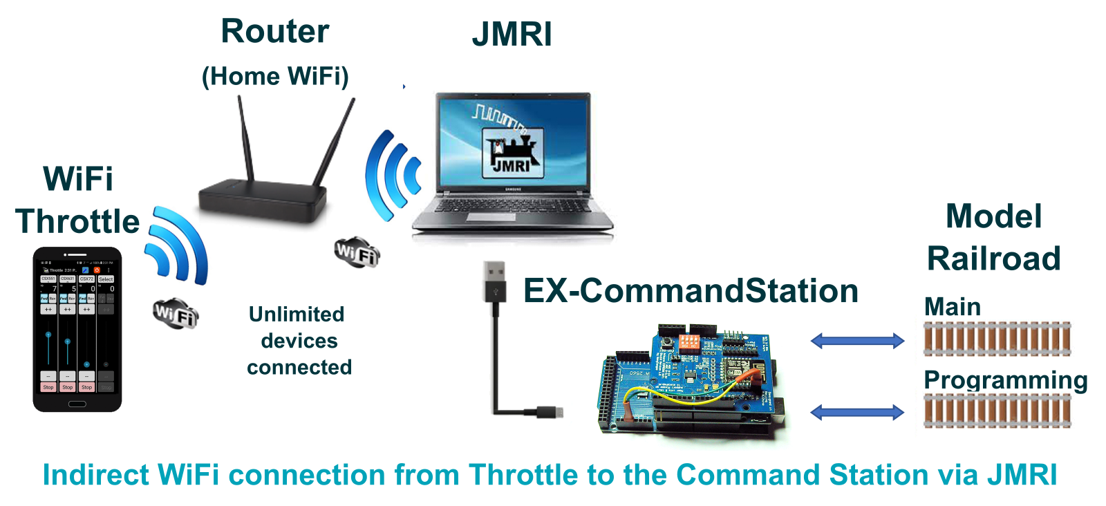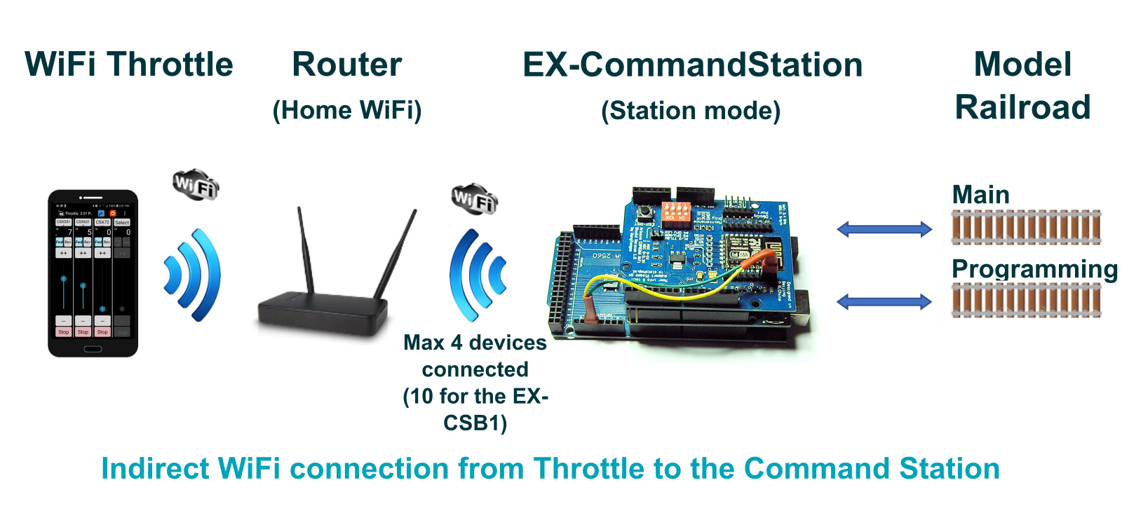 An equally simple way to connect from your wireless device to the EX‑CommandStation is by connecting your command station to you home network. You need a Command Station with a WiFi Shield or other type of WiFi board. Here is an image that represents a indirect connection.