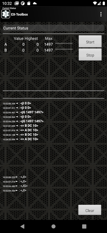 This screen allows you to view the internal EX-Toolbox log of events. (referend to as ‘logcat’).