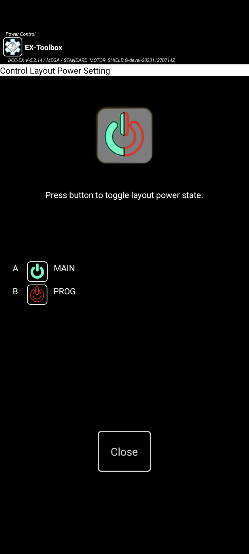 The Power Screen can be accessed from the Menu ‣ Power. This will open the Power Screen where there is a simple button that to turn the power on or off. Use the Close button or Android’s Back button to return to the CV-Programming Screen.