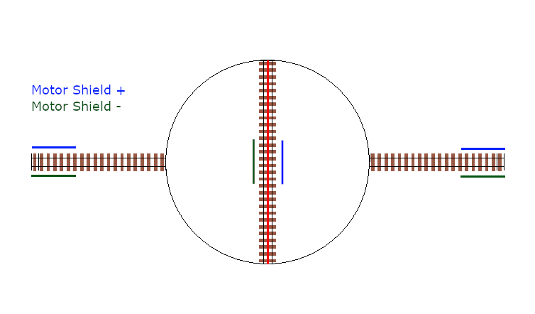 Consider the turntable starting in alignment with the entry and exit tracks, with everything wired in alignment so the +/- connections from the Motor Shield are connected to the same rail all the way along.