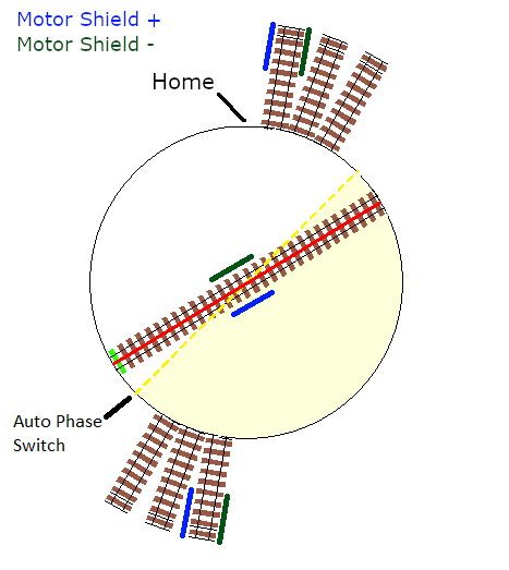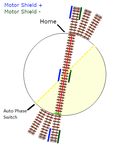 Once the turntable reaches the correct position, all our phases will be in alignment, meaning our locomotive can leave or enter the turntable with no short circuit issues.