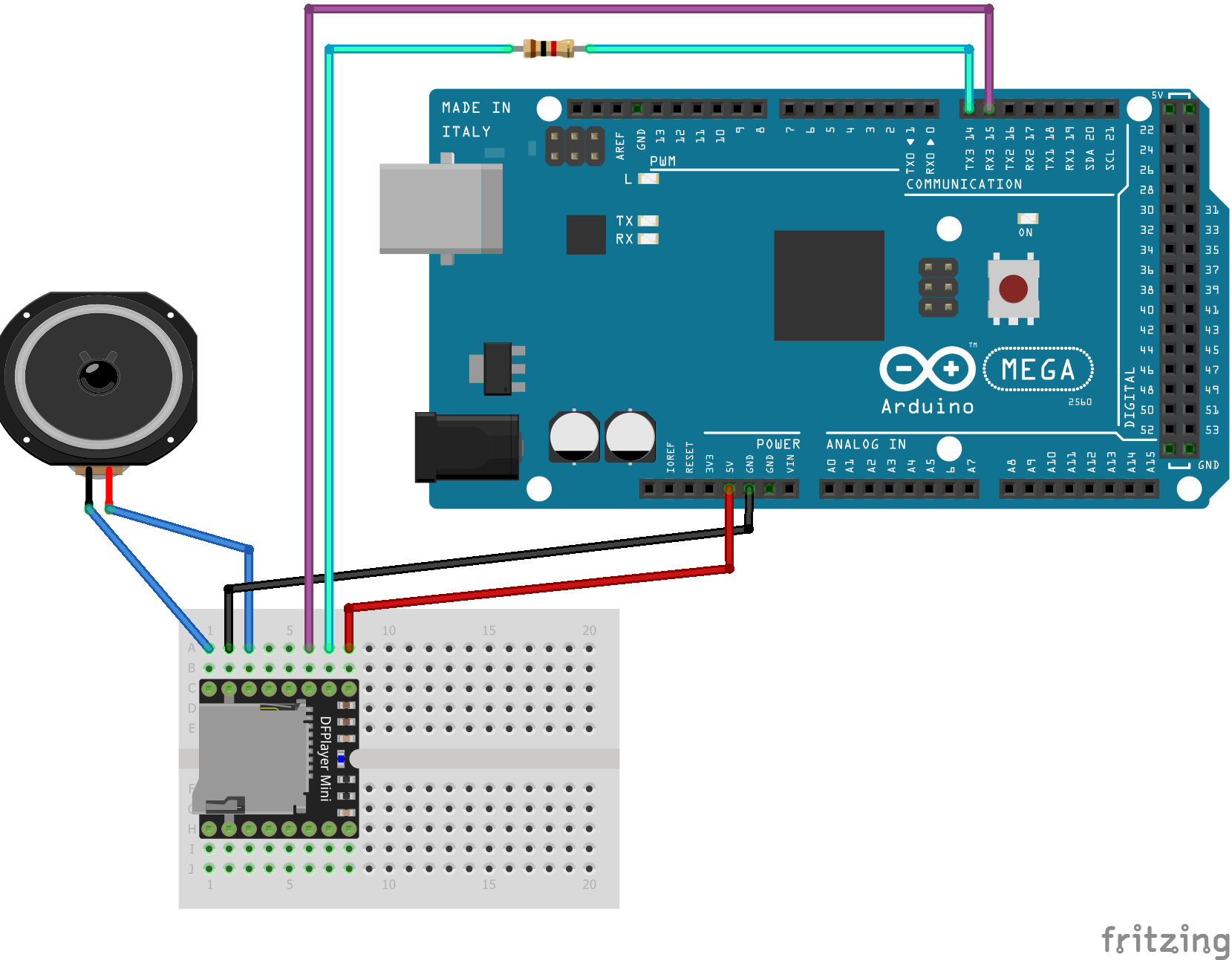 Suppose you want to add a driver for the DFPlayer MP3 Player. This module is widely available for a few dollars and allows MP3 files to be played from a Micro-SD card (up to 32GB). The module is connected to an Arduino serial port, for example on the Mega the pins TX1(14)/RX1(15) which is Serial 3. Connect the DFPlayer’s RX to the Arduino TX3 (14) via a 1kOhm resistor, and DFPlayer’s TX direct to the Arduino RX3 (15). You also need to connect +5V power to VCC, and GND on the Arduino to GND on the DFPlayer. Connect a small speaker to the pins SPK1 and SPK2 on the DFPlayer, and that’s the hardware set up.