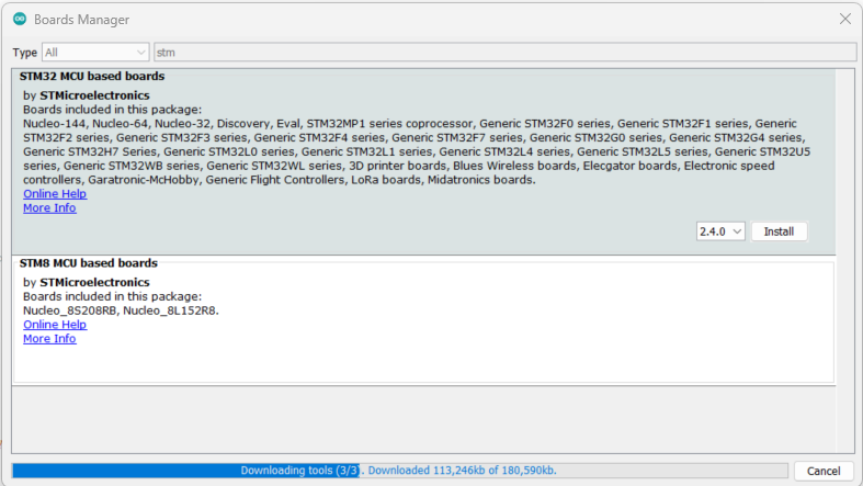 You will then need to navigate to “Tools” -> “Board” -> “Boards Manager”, search for “stm32”, and install the support for these boards.
