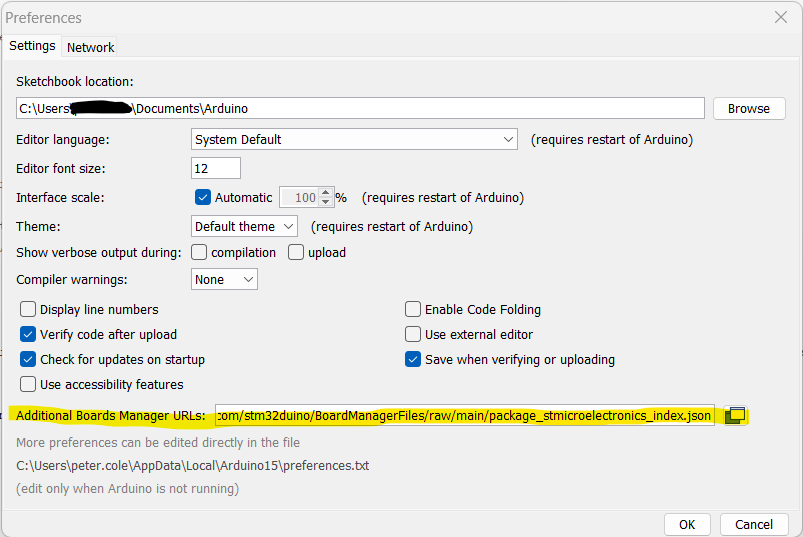 To do this, navigate to “File” -> “Preferences” and add this URL to the “Additional Boards Manager URLs” list: