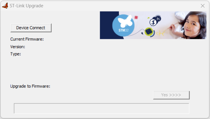 Clicking the “Device Connect” button will attempt to connect to your NUCLEO device and display the currently installed firmware version, along with the version it will attempt to upgrade to.