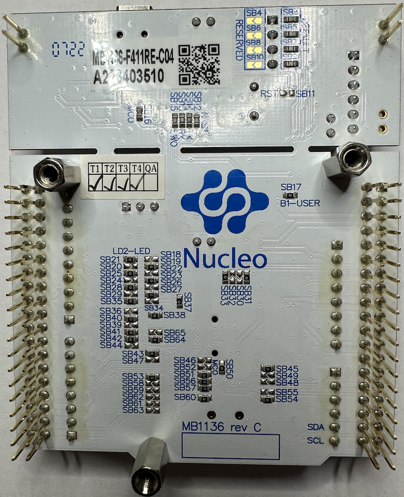 The Morpho pins extend both above AND below the Nucleo-64 series boards! Please be very wary of shorting any of these pins, especially those that protrude below. We recommend mounting 10mm M3 screw hex standoffs into the 3 mounting holes on the main PCB for your safety. See pic here: