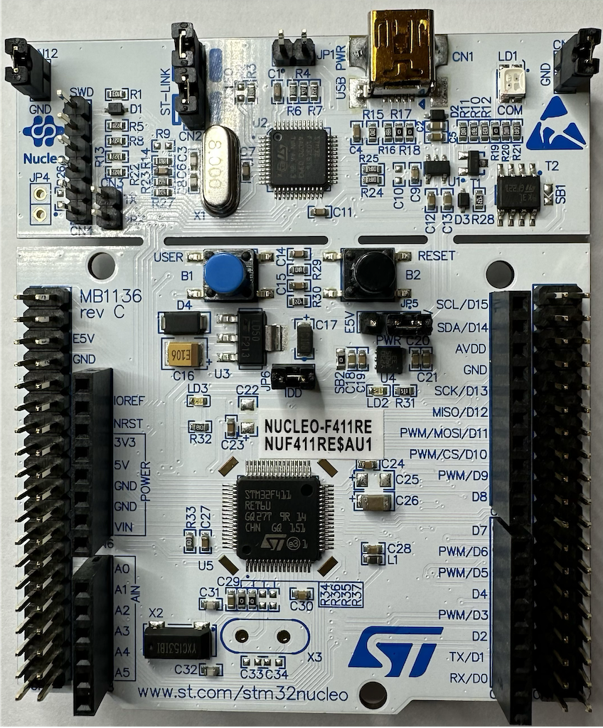 Here is how the NUCLEO-F411RE looks when new, with a top view, and the pinouts. The NUCLEO-F446RE board looks near identical, pinouts are exactly the same, however some of their I/O functions map slightly differently as the F411RE and F446RE microcontrollers are different internally.