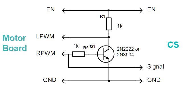 Some motor boards like the IBT_2 and Wingzine boards have two separate PWM inputs, usually labeled LPWM and RPWM for left and right PWM, or CW and CCW for clockwise and counter clockwise. The following circuit will take a single PWM signal from your Command Station, split it in two, and provide the inverted signal to the second PWM pin on 2 signal input motor drivers.