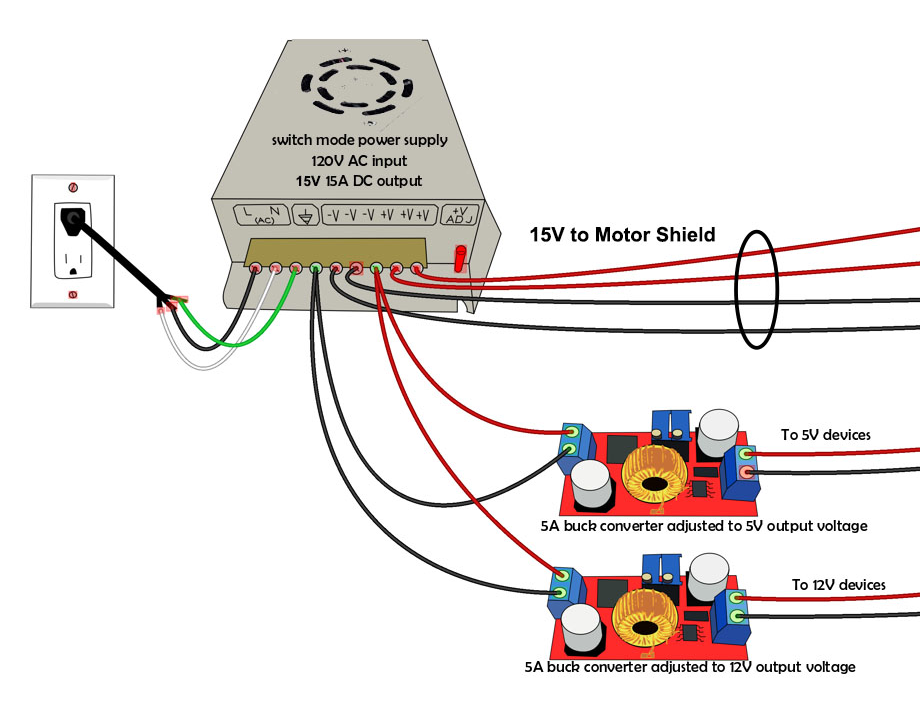 The following image shows how to connect buck converters. You start with a power supply with more voltage than the highest voltage you want to convert and with enough current to drive everything you want to power. This example shows a 15V supply that you can connect directly to the input to the Motor Driver which will in turn power your track. If you need to power 5V and 12V devices, you simply get 2 buck converters, connect them in parallel to the 15V output of your power supply (or to extra 15V outputs on the supply), and adjust each one to the voltage output you want. Then connect the converters to your 5V and 12V bus and connect your devices to the correct bus.