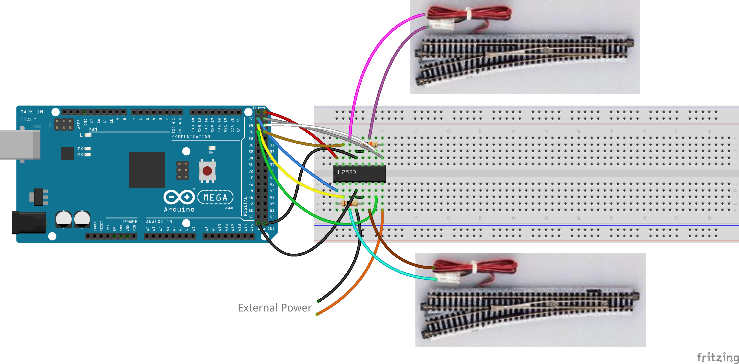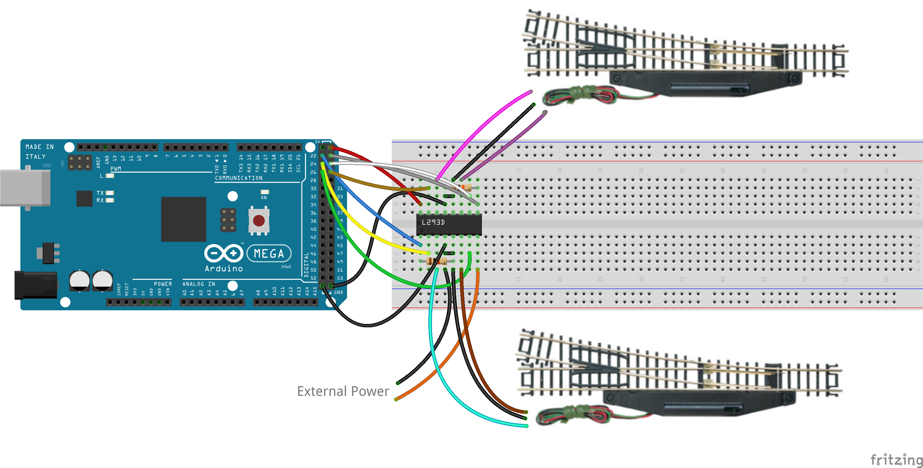 A single L293D motor driver IC can be used to control two turnouts/points and will require six digital output pins either directly from your EX‑CommandStation (as per the diagram above), or these can also be connected via an I/O expander such as an MCP23017 or EX‑IOExpander.