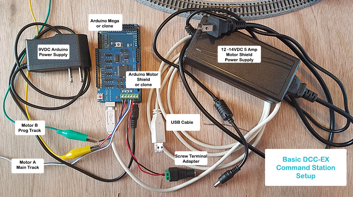 Power Supplies - Why do we recommend a 7-9V power supply for the Mega when the manual says it can handle 12V or even 20V? Can’t you just use one 12V power supply to power both of them? Short answer; NO. You want two supplies (or one supply that splits out 2 voltages). The Arduino Mega only needs around 7V to operate. Any voltage over that is wasted as heat and can burn out the regulator on the board. And most people want a minimum of 12V into the Motor Board, while many want 14V (for N and HO Scale). Where your Mega could run hot for a while with 12V, if 14V from the Motorboard was connected to the Mega, it would destroy it. Cut the trace and use 2 power supplies.