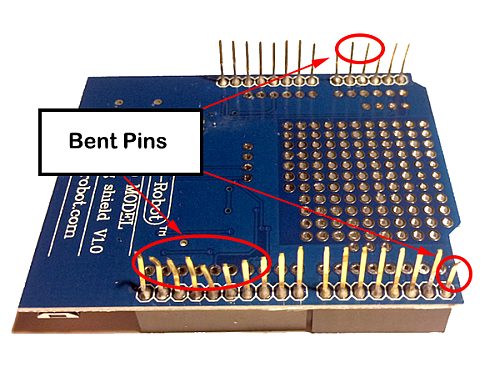 Otherwise, sight down both rows of pins on the motor board and make sure they are all straight. They should all line up in a row and not be bent in any plane, just like the teeth on a comb. If any look like the photo below, bend them with your fingers and/or needle nose pliers.