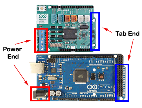 You want to line up pins 0-7 on the Mega with the same pins on the motor board.