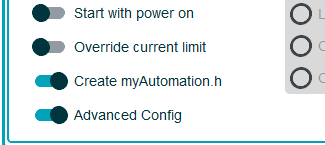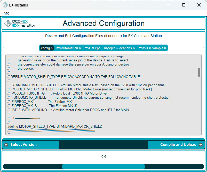 Note there is an additional option CreatemyAutomation.h that allows a blank myAutomation.h file to be created, which you can edit on the following Advanced Config screen. Leaving this option disabled means a myAutomation.h file will not be generated if it is not required, which saves memory on your EX‑CommandStation device.
