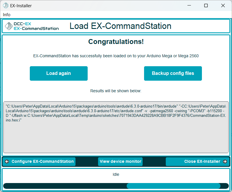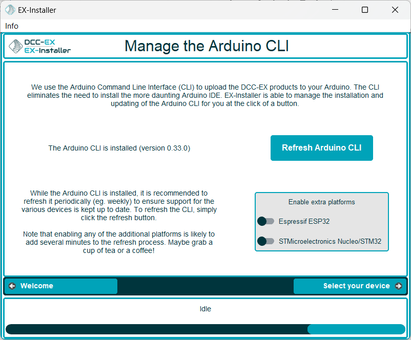 We use the Arduino Command Line Interface (CLI) to upload the DCC-EX products to your Arduino. The CLI eliminates the need to install the more daunting Arduino IDE. EX-Installer is able to manage the installation and updating of the Arduino CLI for you at the click of a button.