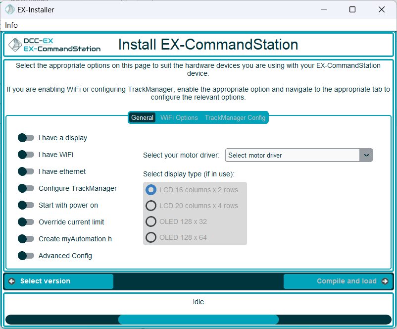 You must select the motor driver type that you have installed. The installer can’t detect this, so you must select the correct board or the EX‑CommandStation may not work.