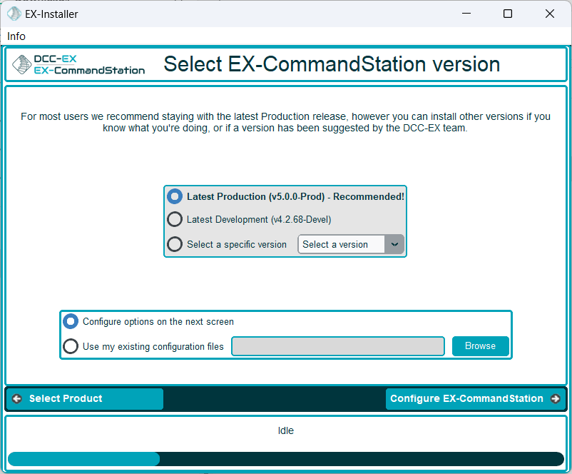 Select which version of the EX‑CommandStation software to load onto your hardware. If you are unsure, or unless you have been otherwise directed by the support team, we recommend you select LatestProduction.
