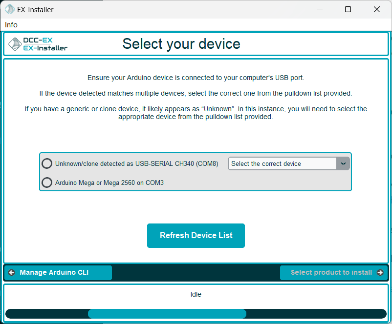 EX‑Installer will attempt to work out what type of Arduino you have connected, but in some cases it will not be able to do so. (This is especially common with cheap clone devices.)