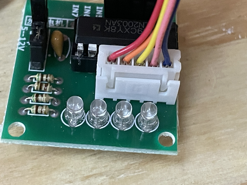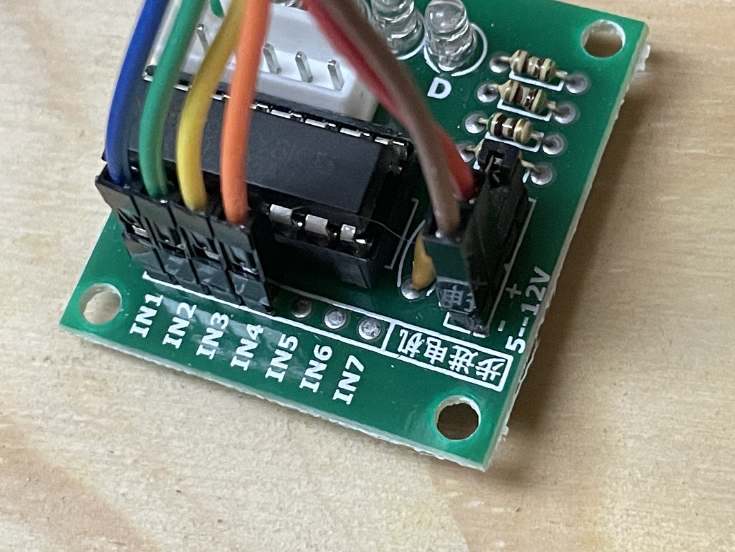 Firstly, note that the ULN2003 controller will have four pins marked “IN1” through “IN4”, as well as a pair of pins with “+” and “-”. There is a likely a jumper installed across two pins beside these that is unmarked, leave this in place.
