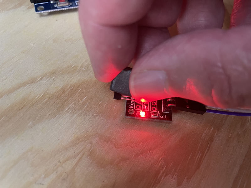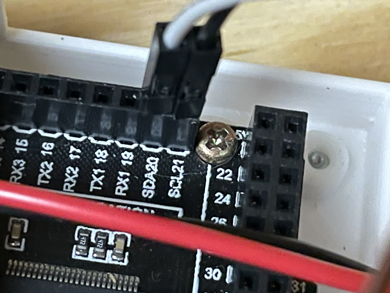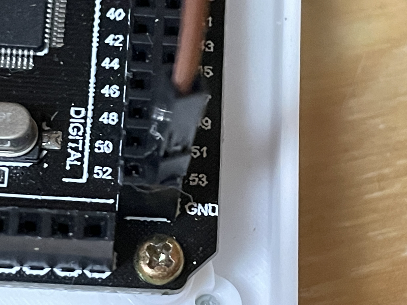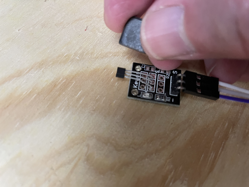 The hall effect sensor has three pins, and likely only two of these pins are marked, the left with “-” and right with “S”. The middle pin is likely to be unmarked, and will be the 5V pin. There are probably many different varieties of sensors and designs out there, but both that I have (from different suppliers) are marked identically.