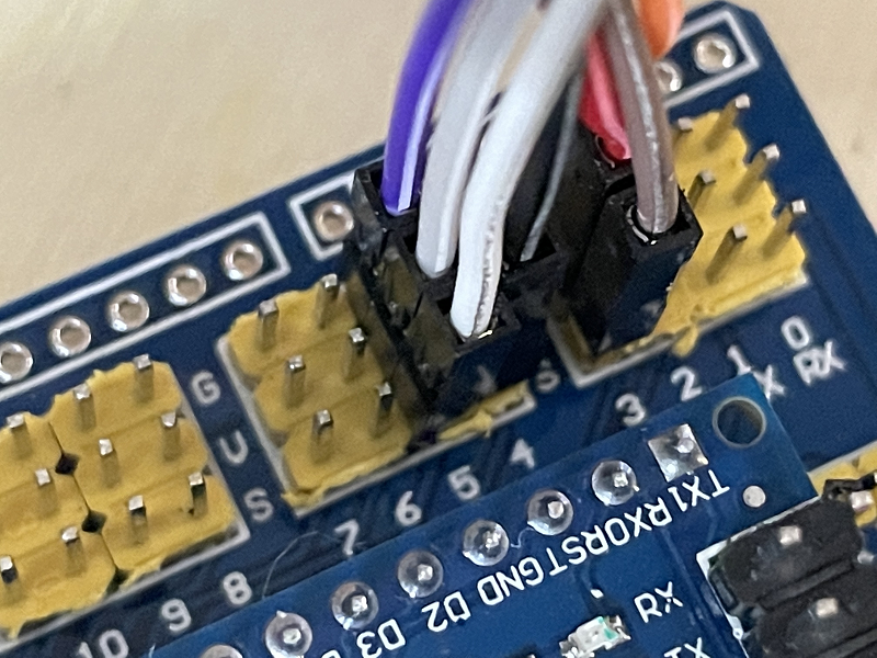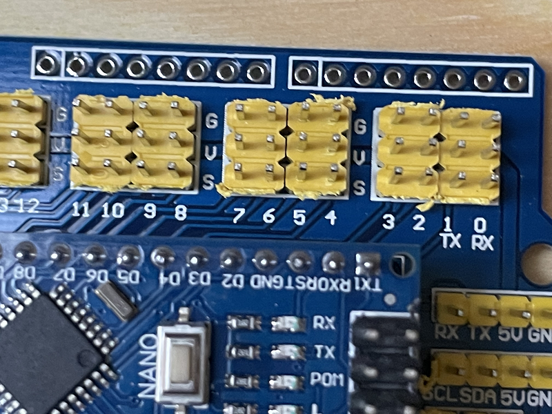 With the shield used in these assembly photos, you will note that each of the Nano GPIO pins has three pins associated with it marked “G” for ground, “V” for 5V, and “S” for signal, with this last pin being the actual Nano GPIO pin.
