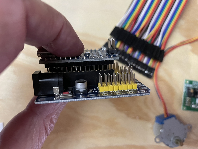 We will also assume a prototyping shield is available that provides regulated 5V power sufficient for driving the ULN2003/28BYJ-48 stepper combo, and that there is a power supply with a suitable DC power plug to suit the prototyping shield.