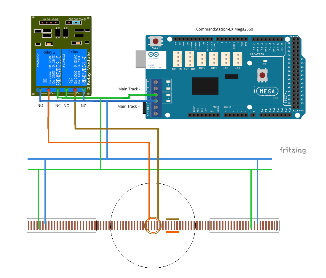 Conversely, the main track negative (- green) get connected to the normally open (NO) of relay 1, and normally closed (NC) of relay 2.