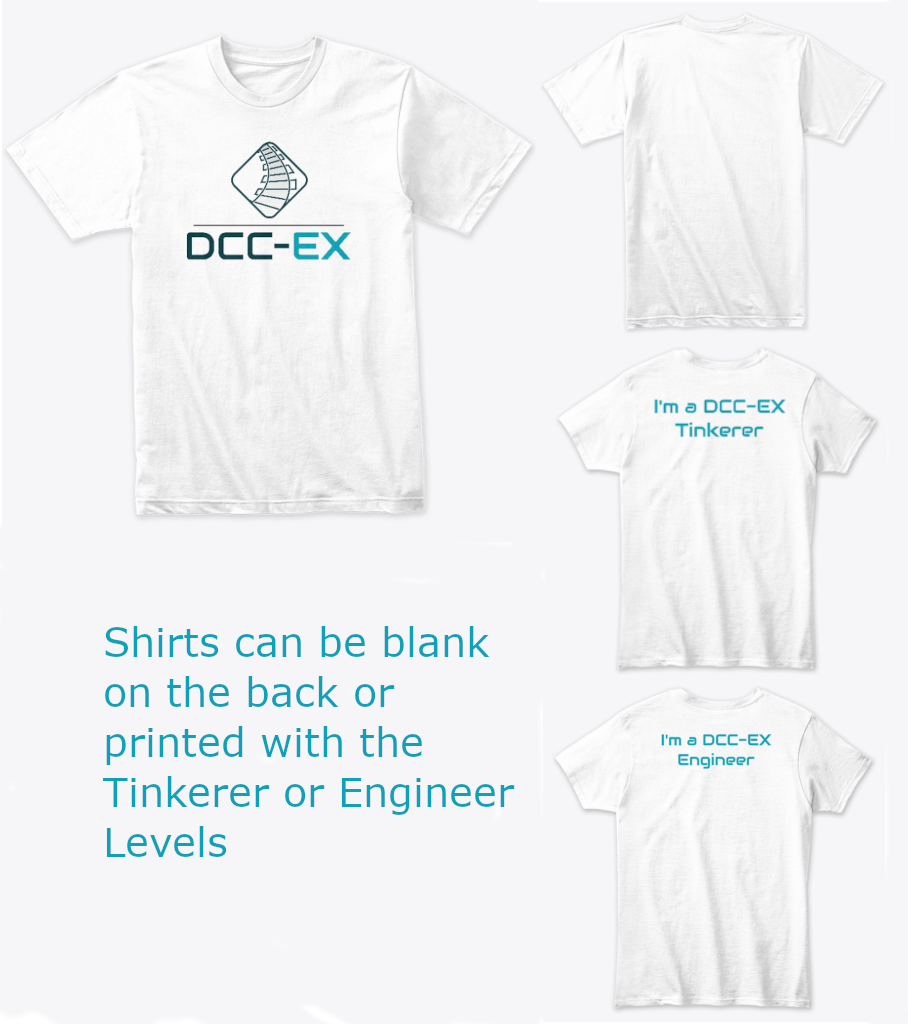 NOTE: There are 3 styles of shirts, plain back, “I’m a DCC-EX Tinkerer” on the back, and “I’m a DCC-EX Engineer” on the back. Be careful to choose the style you want. Shirts with printing on the back cost slightly more.