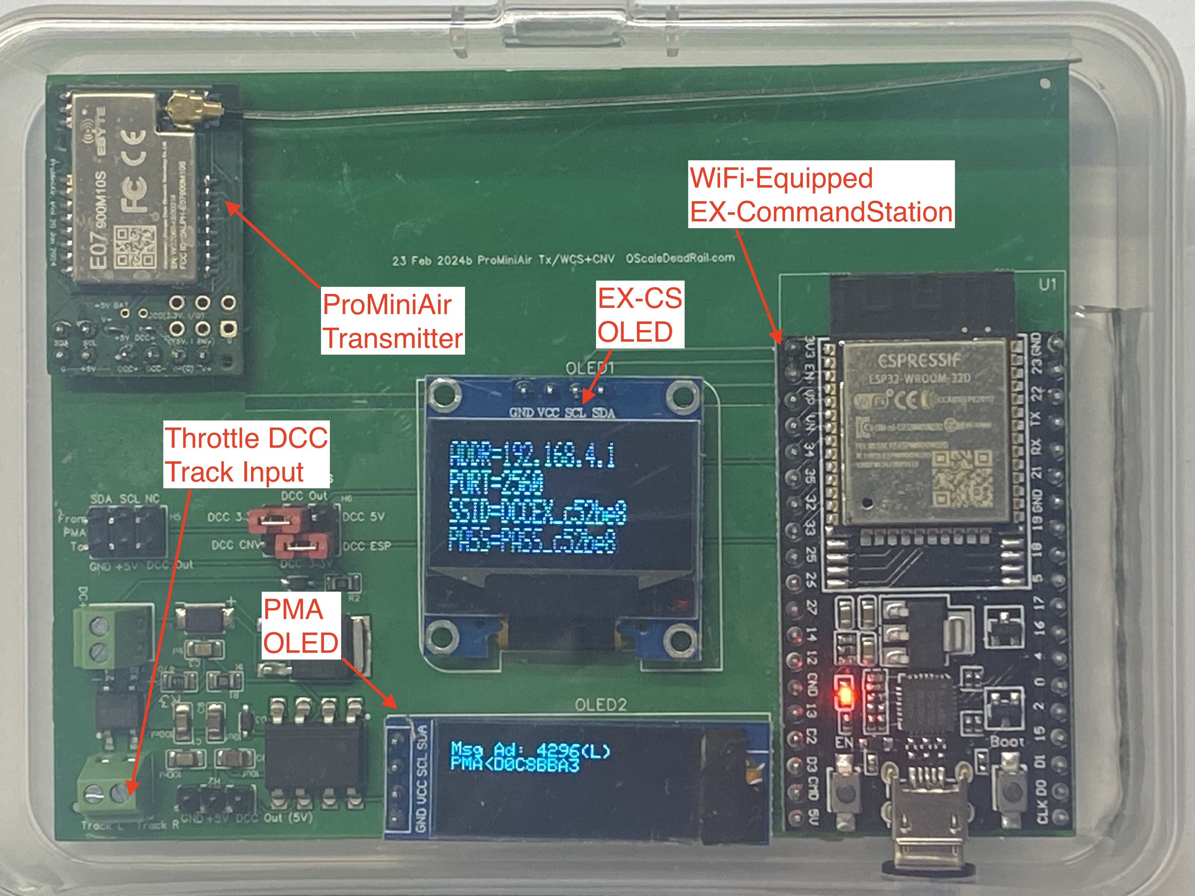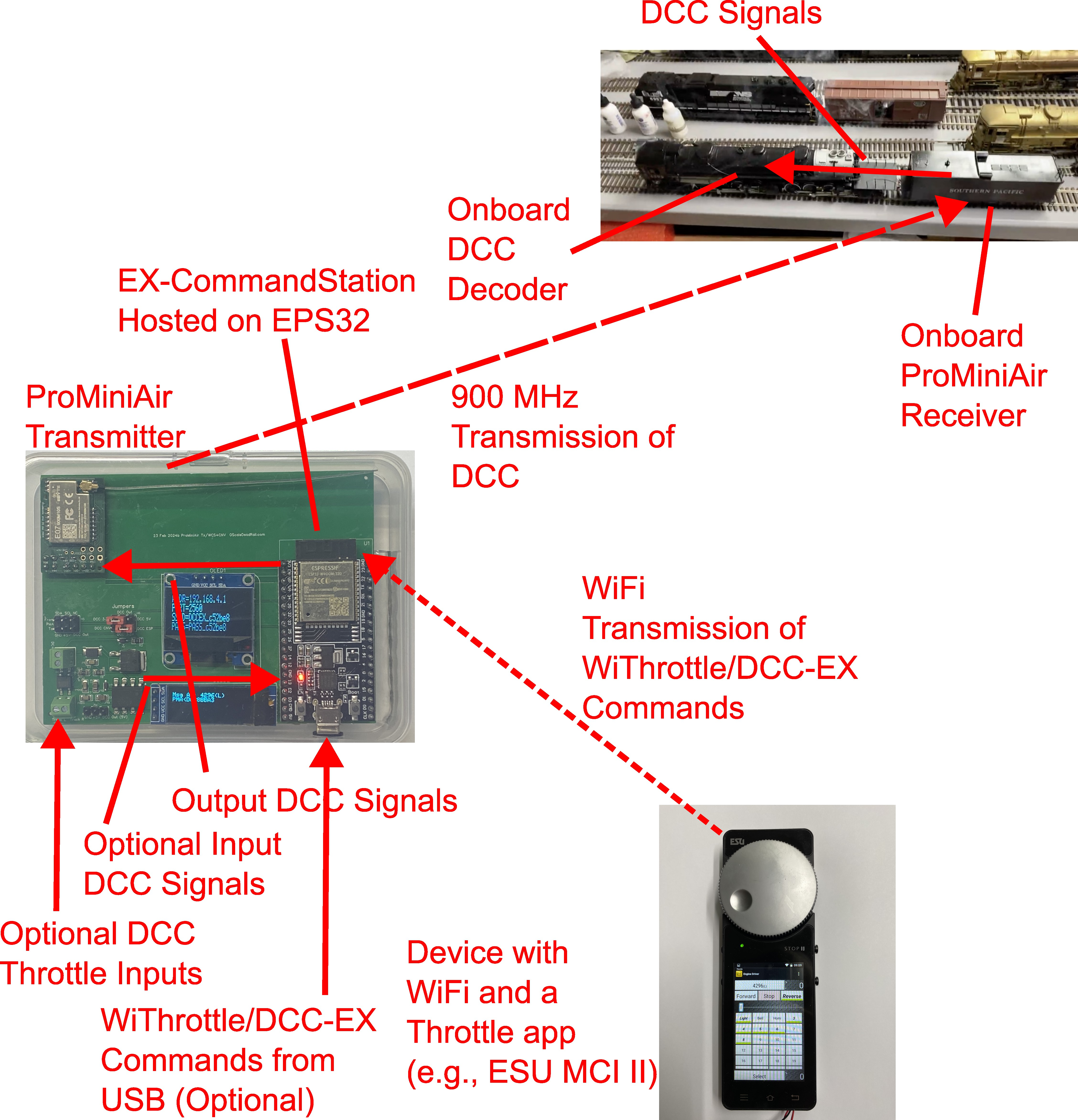 The ProMiniAir Transmitter is integrated with a WiFi-equipped ESP32-WROOM hosting a slightly modified version of EX‑CommandStation firmware, which is available, along with additional libraries, at this GitHub site. Instead of a motor shield, the DCC commands from the EX‑CommandStation are sent to the ProMiniAir Transmitter that wirelessly transmits the DCC to compatible onboard radio receivers with their integrated amplifiers that “reconstitute” DCC Track Right/Left for onboard DCC decoders.