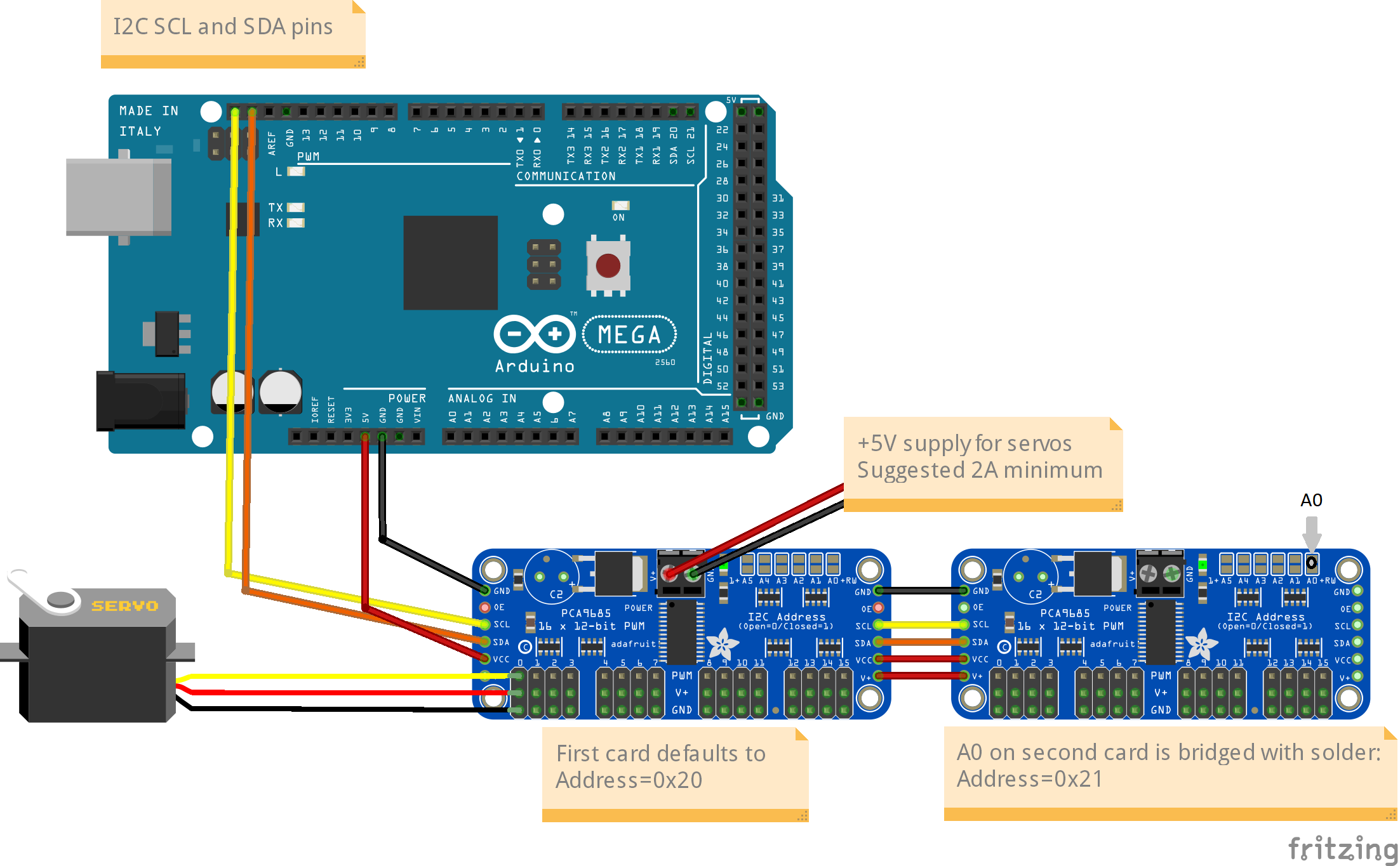 Figure 221 Connecting a PCA9685 Servo Controller to an Arduino Mega