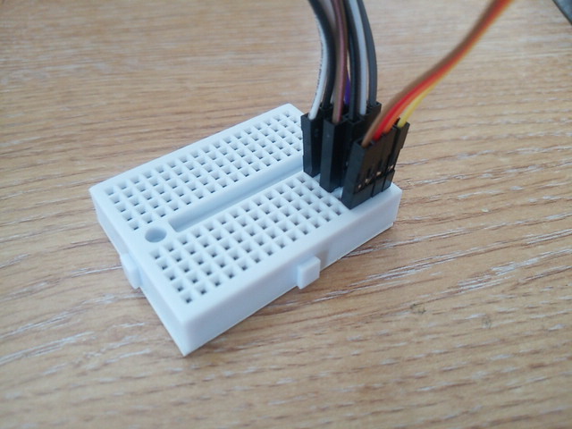 I use a small piece of stripboard with various 4-way pin headers and sockets soldered in, to allow various devices to be plugged in and removed as required. There is a mixture of pin headers and sockets (which accept Dupont cables) and JST-XH male sockets (which accept female cable connectors, or female Dupont connectors. I also have a four-way socket header connected in parallel, into which an OLED display is fitted for testing.