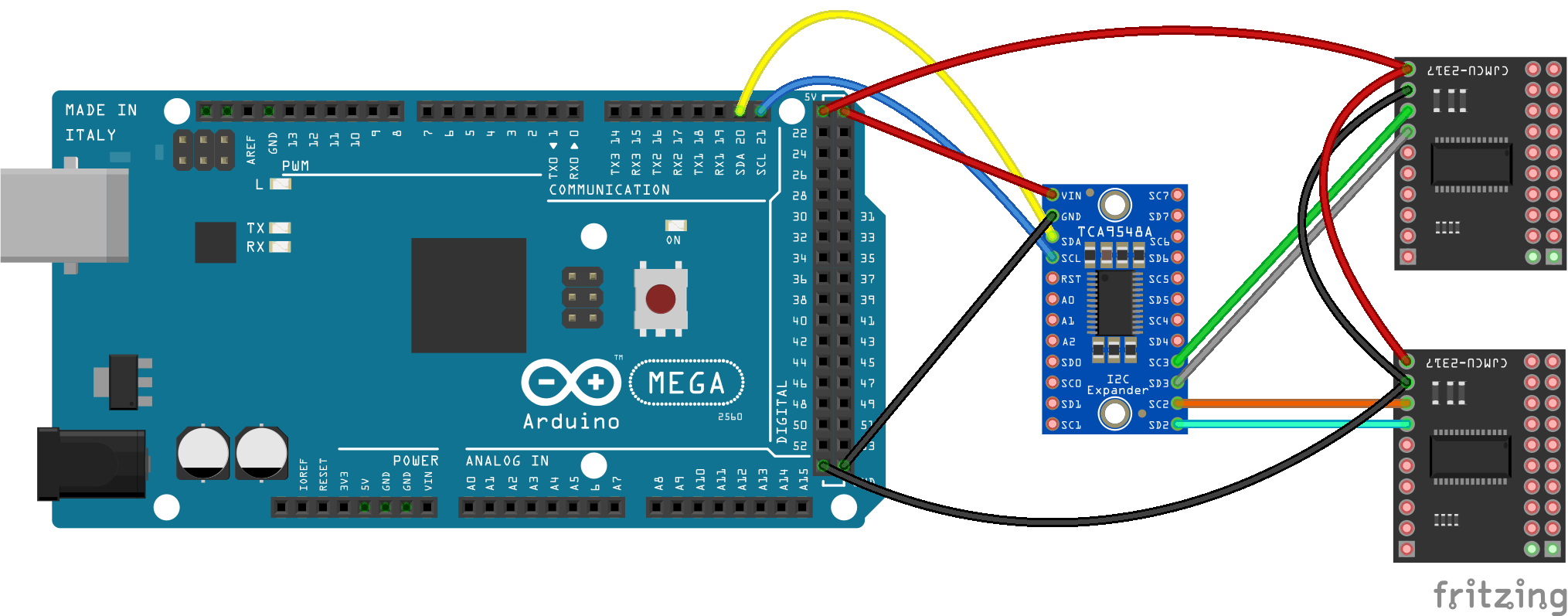 Shown below is an Arduino Mega with a TCA9548A 8-channel multiplexer attached.